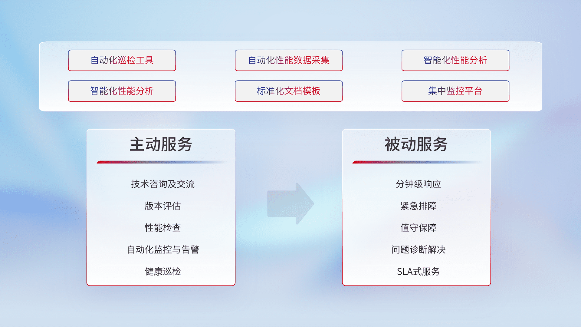 智能化工具和标准化文档,,,,保障服务质量,,,,提供主动服务(包含技术咨询、、、版本评估、、、性能检查、、、、自动化监控与告警、、健康巡检)和被动服务包含(分钟级响应、、紧急排障、、、值守保障、、问题诊断解决、、、、SLA服务)。。。。