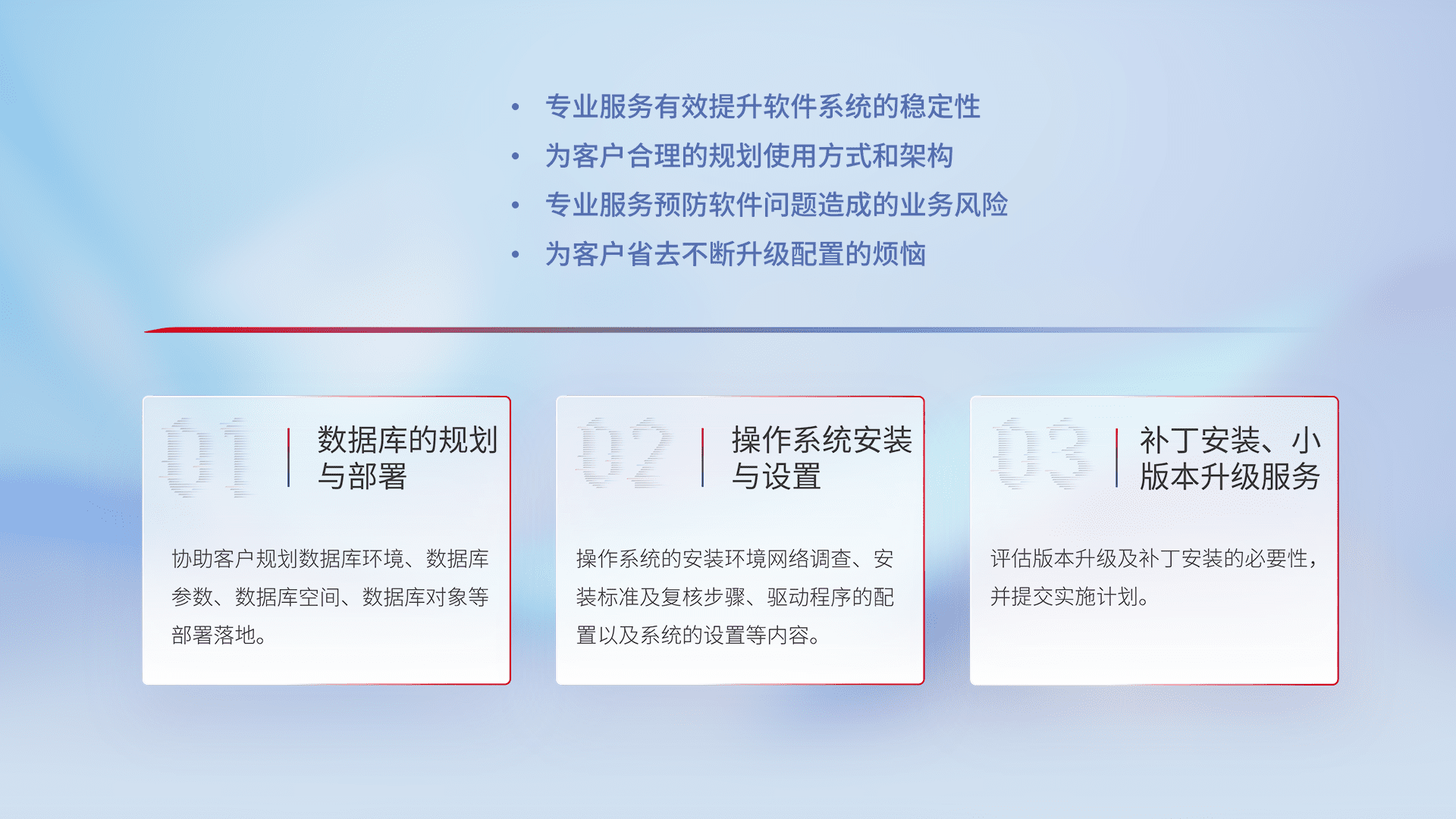 为客户提供软件规模升级、、、、快速部署、、按需配置的专业服务,,从数据库的规划与部署到操作系统的安装与设置,,,,再到补丁安装和小版本升级提供支持。。。